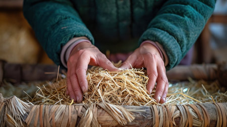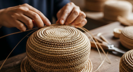 A skilled artisan's hands meticulously work with natural fiber material, showcasing the beauty of traditional crafting techniques in a workshop setting.