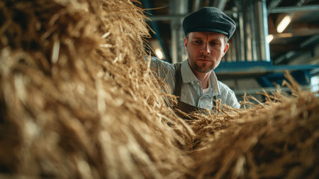 A worker with a neutral expression inspects barley quality in a clean agricultural workspace. The scene is lit with balanced studio lighting, conveying a trustworthy food sourcing mood.