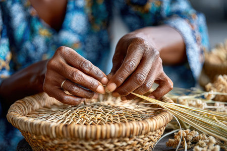 Craftsman's hands weave a basket, showcasing real textures and skilled craftsmanship essence