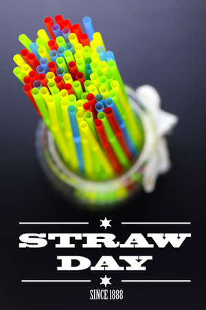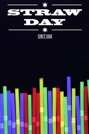 straw day since 1888 text on background colorful cocktail tubes lie on a black background