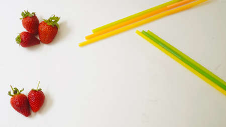 Strawberries and yellow orange juice straws with background.