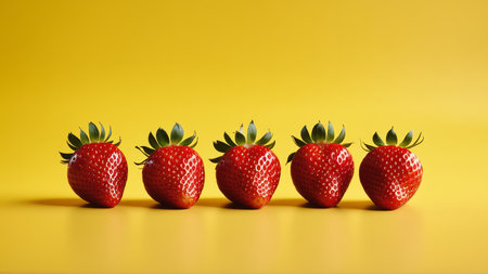 Vibrant row of fresh strawberries on bold yellow background.