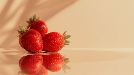 A group of fresh strawberries sits on a reflective surface, illuminated by soft natural light, highlighting their vibrant colors and inviting texture, perfect for food photography.