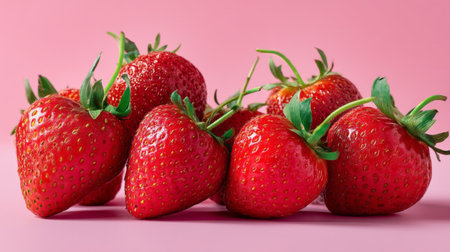 A collection of fresh and ripe strawberries set against a soft pink background, creating a vibrant and appetizing scene perfect for food photography and presentations.