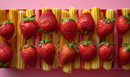 A vibrant display of fresh strawberries positioned on a colorful pink and yellow background, showcasing the beauty of natural fruits and inviting a sense of health and freshness.
