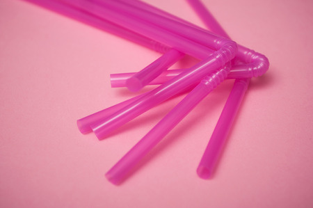 closeup of pink plastic straw collection on pink background