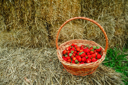 Strawberries in basket hat at haystack