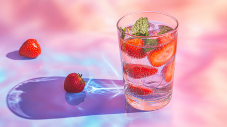 A refreshing drink featuring strawberries and mint leaves in a clear glass, set against a colorful backdrop. Perfect for summer gatherings!