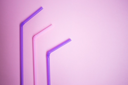 Plastic drinking cocktail straws on pink background, top view. Make a cocktail.
