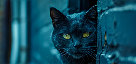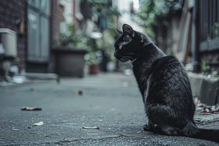 Black cat is sitting on the pavement in front of a building. The cat is looking at the camera, and the scene has a somewhat eerie or mysterious mood