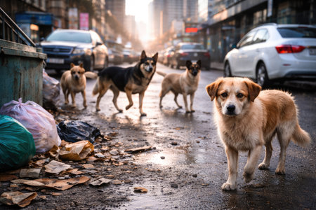 Group of Stray Dogs Standing on Dirty Urban Street Highlighting Animal Homelessness