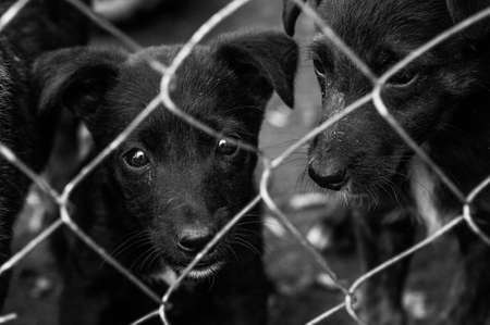 A poignant image of a sad black dog gazing through a chain link fence, evoking feelings of loneliness and longing in a natural setting. Ideal for emotional themes.