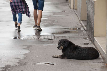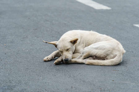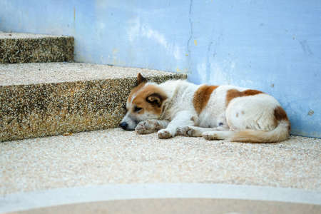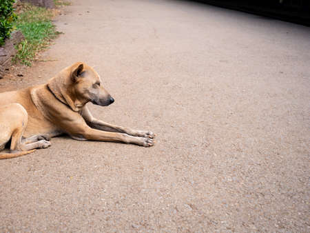Abandoned homeless stray dog is lying in the street. Lonely homeless stray dog is laying at footpath.