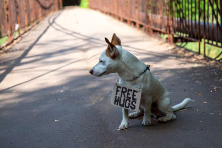A dog of Jack Russell Terrier breed sits in the forest on a concrete bridge with a cardboard sign on his chest,with the inscription 'Free Hugs'.He sits half a turn with a had turn on the side