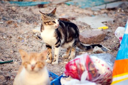 Homeless lonely thin hungry cat walks among garbage in landfill. Concept poor and sick animal