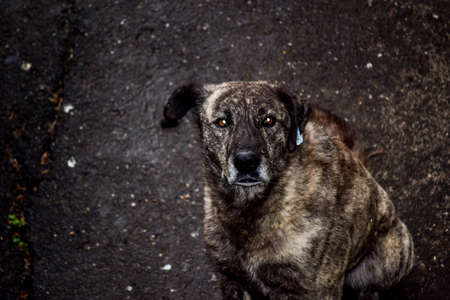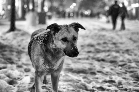 A stray abandoned dog during the night on the busy city street in Istanbul. People walking past the hungry abandoned dog.