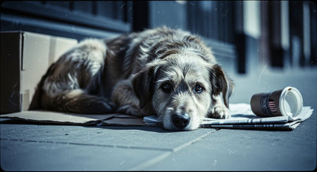 Homeless dog lying on the floor with a newspaper and a cup of coffee