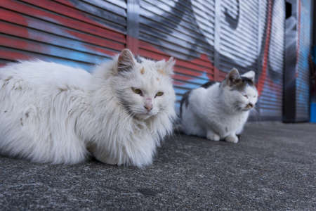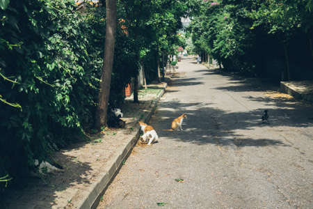 Homeless cute cats eat food on the street on asphalt on sidewalk. Turkey, Istanbul. The problem of homeless animals in cities.