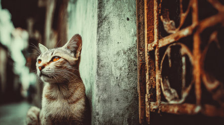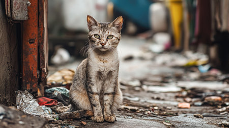 A solitary stray cat sits in a cluttered urban alley, surrounded by debris and soft light, showcasing its detailed fur and expressive eyes, embodying resilience.