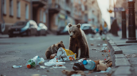 Curious bears examining trash, looking at camera, blurred background, ample space for text