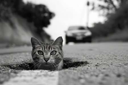 A black and white photo of a cat sitting in a pit on the road. Cat on the highway look at the camera.