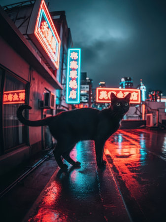 A black cat stands on a wet street at night, surrounded by vibrant neon signs illuminating the area. The reflections of the neon lights shimmer on the wet pavement, creating a mesmerizing urban scene.