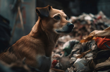 Brown dog sitting on garbage piles looking at sunset. One sad lost animal. Generate Ai
