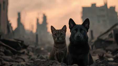 A Cat and Dog Paused Amidst the Ruins of a Dystopian Landscape at Sunset, Symbolizing Resilience and Survival in Tough Times