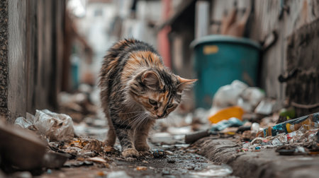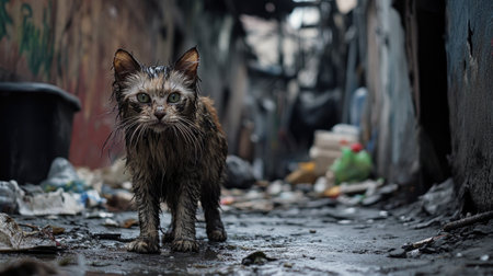 This evocative image features a wet stray cat standing alone in a grimy urban alley full of debris, showcasing its resilience in the harsh city environment.
