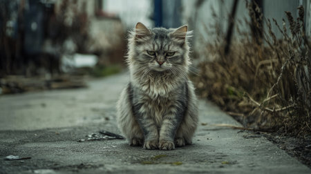 A serene grey cat sits thoughtfully on a pathway, embodying the essence of solitude amid an urban backdrop. Its contemplative gaze captures a moment of quiet reflection.