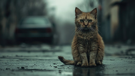 A solitary street cat sits on a wet pavement, surrounded by an urban backdrop. The gloomy atmosphere and focus on the animal highlight themes of solitude and resilience.