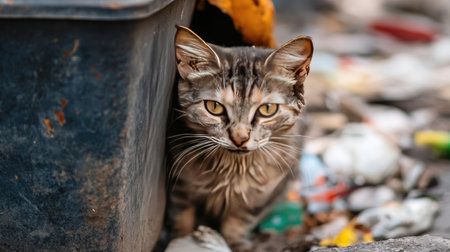 A curious stray cat peeks out from behind a trash can, blending into the littered urban landscape. The image captures the essence of city life and animal resilience.