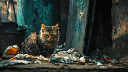 A stray cat with matted fur sits among garbage and debris in a gritty urban setting, showcasing a poignant expression. The natural light highlights the cat