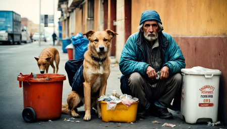 A man in a blue coat rests with his loyal dogs among colorful bins on a city sidewalk. Their calm demeanor against an urban backdrop speaks of adaptability and mutual reliance.