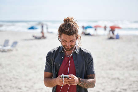 happy young man using smartphone on beach enjoying sunny day listening to music wearing earphones