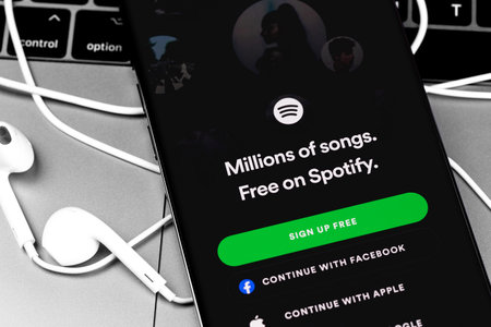 Close up view of hand with smartphone and Spotify logo on display. Laptop on background. New technology, social media, network, communication, concept. Milan, Italy - October 2021