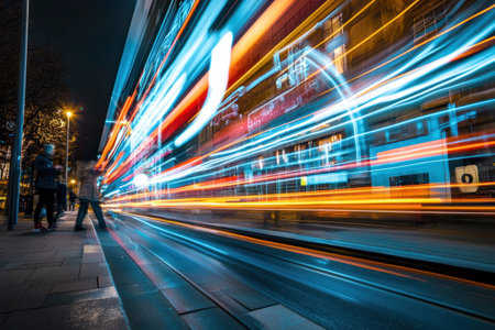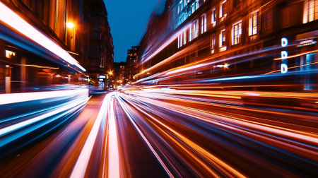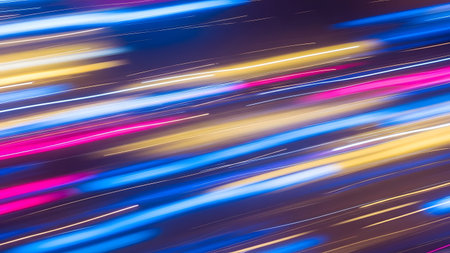 Vibrant light trails create an abstract representation of speed and motion at night, showcasing the dynamic energy of urban environments in a captivating visual display.