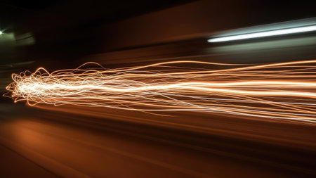 Dynamic motion blur of light trails resembling lightning on a dark background