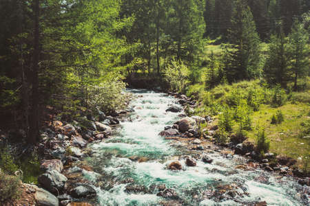 A fast-flowing wide and full-flowing mountain river. Large rocks stick out of the water. Big mountain river Katun, turquoise color, in the Altai Mountains, Altai Republic.
