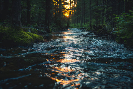 A tranquil stream flows gently over moss-covered rocks, creating a serene and refreshing atmosphere. The sparkling water reflects sunlight, highlighting nature's beauty.