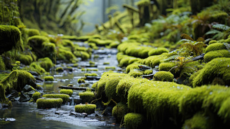 Mossy rocks in the green forest with a stream in the background