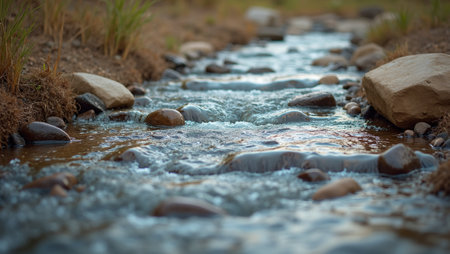 A peaceful stream winds through a bed of smooth, rounded stones, creating a serene atmosphere. Sunlight glimmers off the water, capturing the beauty of nature's untouched landscape.