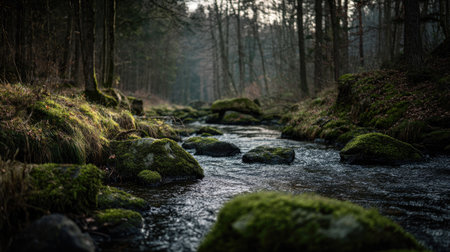 A serene view of a forest stream winding through lush greenery and moss-covered rocks. The soft natural light enhances the tranquil atmosphere, inviting exploration.