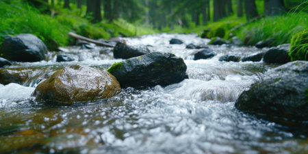 A tranquil stream flows gently over moss-covered rocks, creating a serene and refreshing atmosphere. The sparkling water reflects sunlight, highlighting nature's beauty.