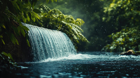 A tranquil waterfall cascades gently into a serene pool, surrounded by lush foliage. Raindrops create a soothing atmosphere, enhancing the natural beauty and calmness of the scene.