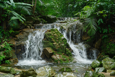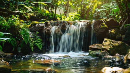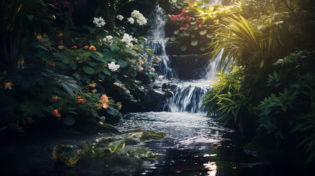 Tranquil waterfall in lush tropical garden with sunlight