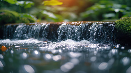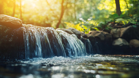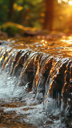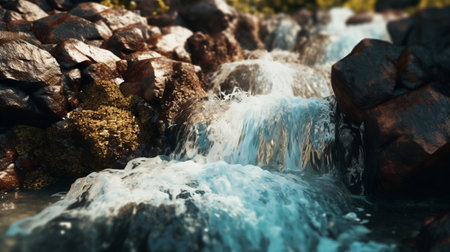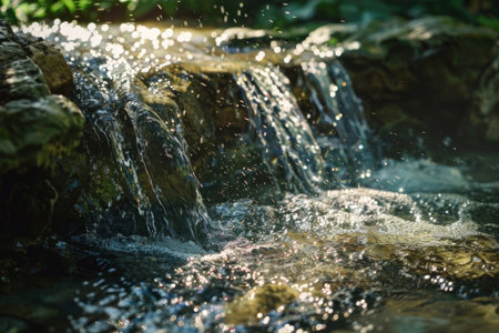 A close up of a waterfall with the sun shining on it, AI