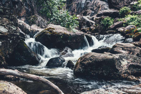 Small waterfall in the forest. Mountain river with clear water and rocks.