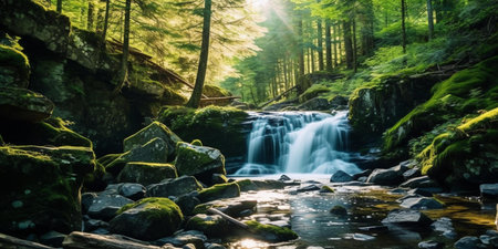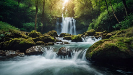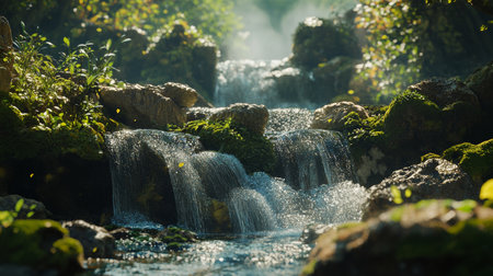 Close up of a tranquil waterfall in a lush forest with sunlight and mossy stones