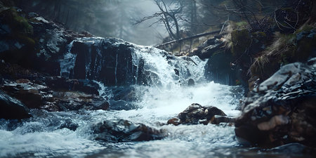 Majestic and rugged cliff waterfall in a pristine natural environment with wild water cascading over textured rocks. Creating a refreshing and pure stream
